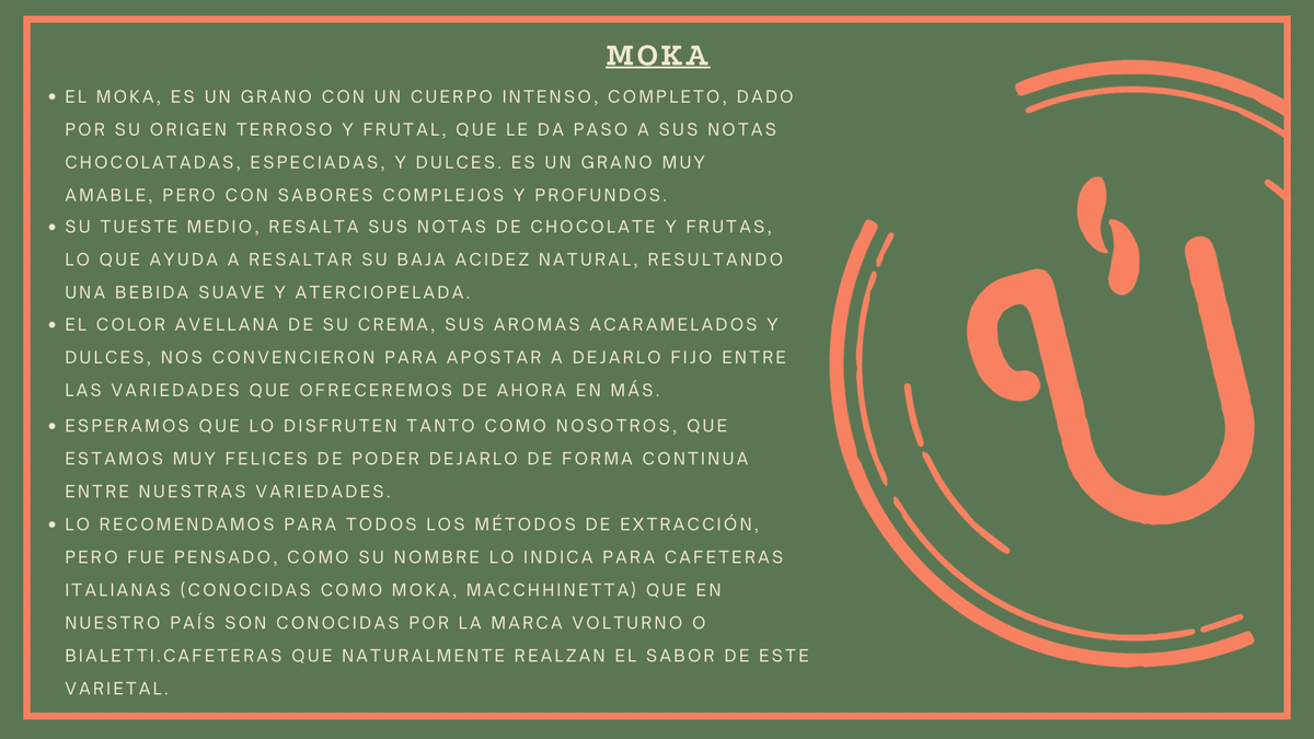 El café Moka destaca por su cuerpo intenso y completo, con un perfil terroso y frutal que resalta sus notas de cacao, chocolate amargo, avellana, especias y nuez. Su tueste medio potencia estos sabores profundos y complejos, mientras que su acidez media baja contribuye a una bebida suave y aterciopelada.