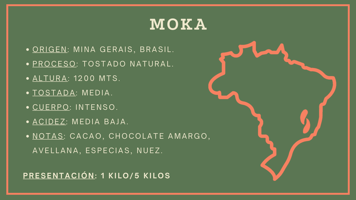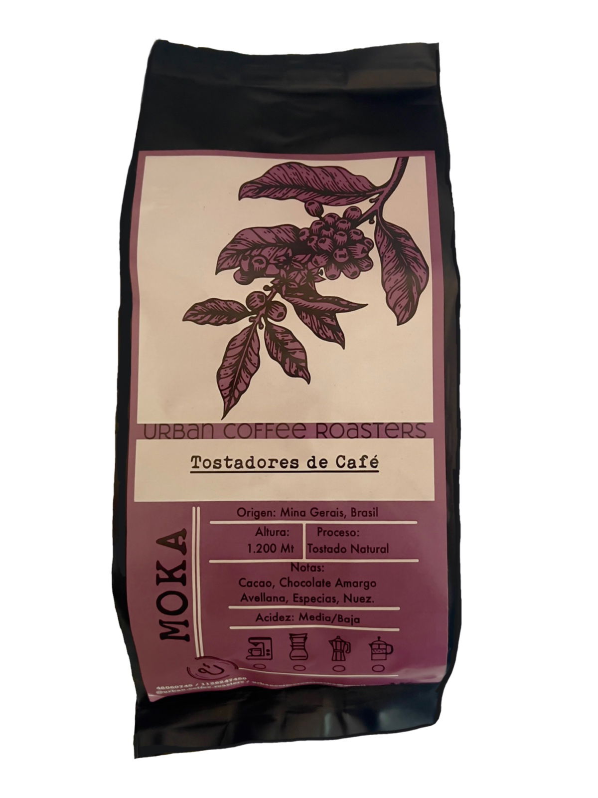 El café Moka destaca por su cuerpo intenso y completo, con un perfil terroso y frutal que resalta sus notas de cacao, chocolate amargo, avellana, especias y nuez. Su tueste medio potencia estos sabores profundos y complejos, mientras que su acidez media baja contribuye a una bebida suave y aterciopelada.